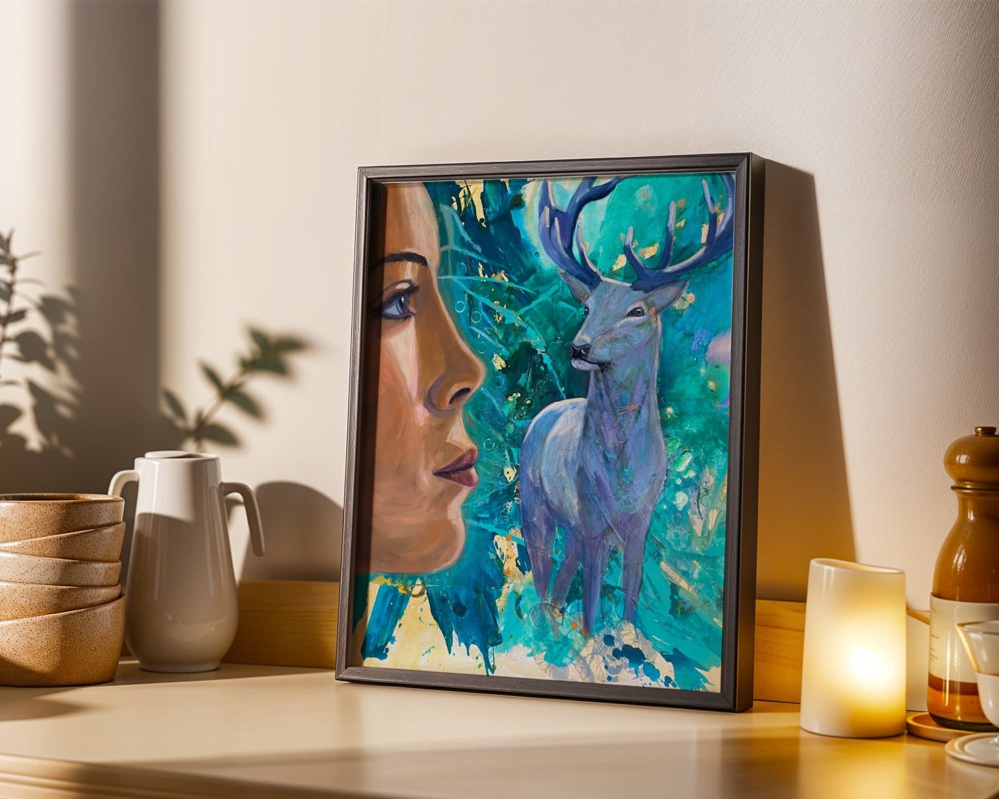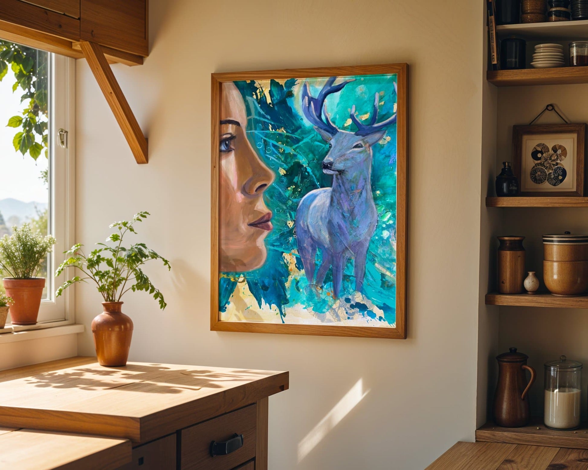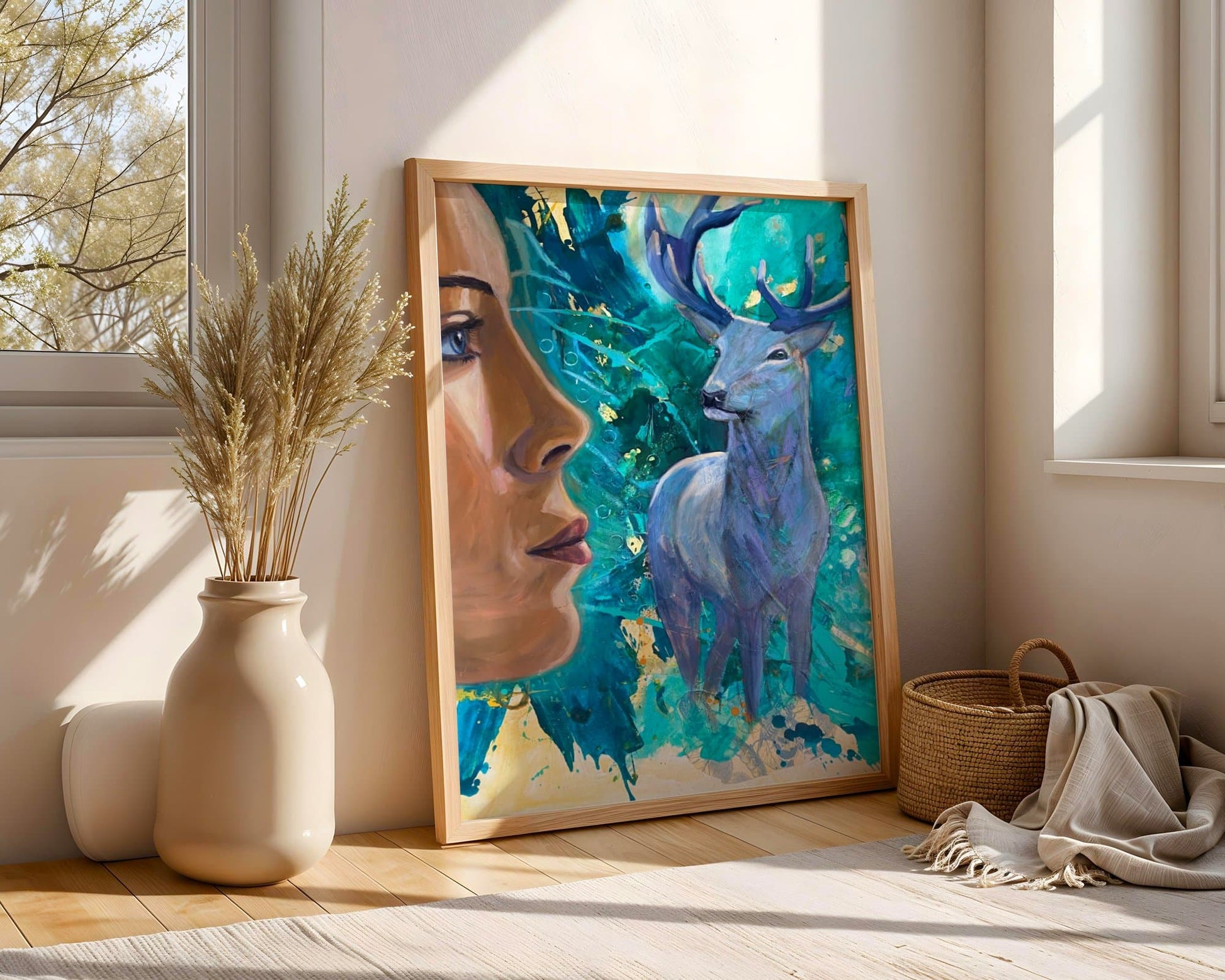 With antlers reaching toward the sky and hooves rooted firmly in the earth, the deer reminds us of the harmony between heaven and soil, spirit and matter. This painting honors the women who guard the earth — those who nurture, protect, and draw strength from their primal feminine power. It is a call to remember your role as both creator and guardian, deeply connected to nature and to yourself.